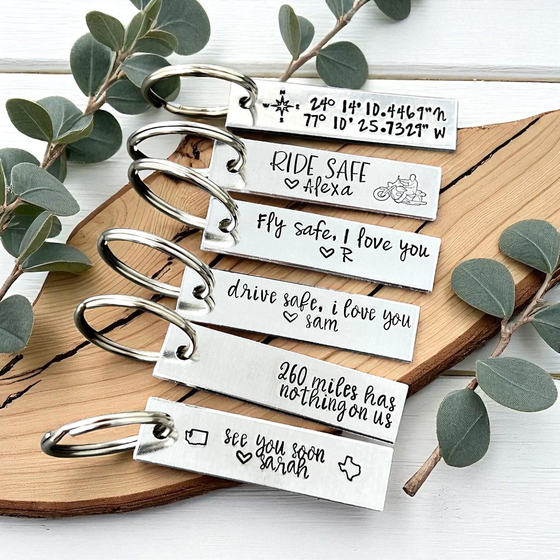 •Please remember that we hand stamp each keychain so there may be some slight variations. Sometimes not all letters and/or numbers will be perfectly aligned as this is the nature of hand stamping. This adds character and uniqueness to your items. We do try our best though to achieve that perfect and straight look :)
