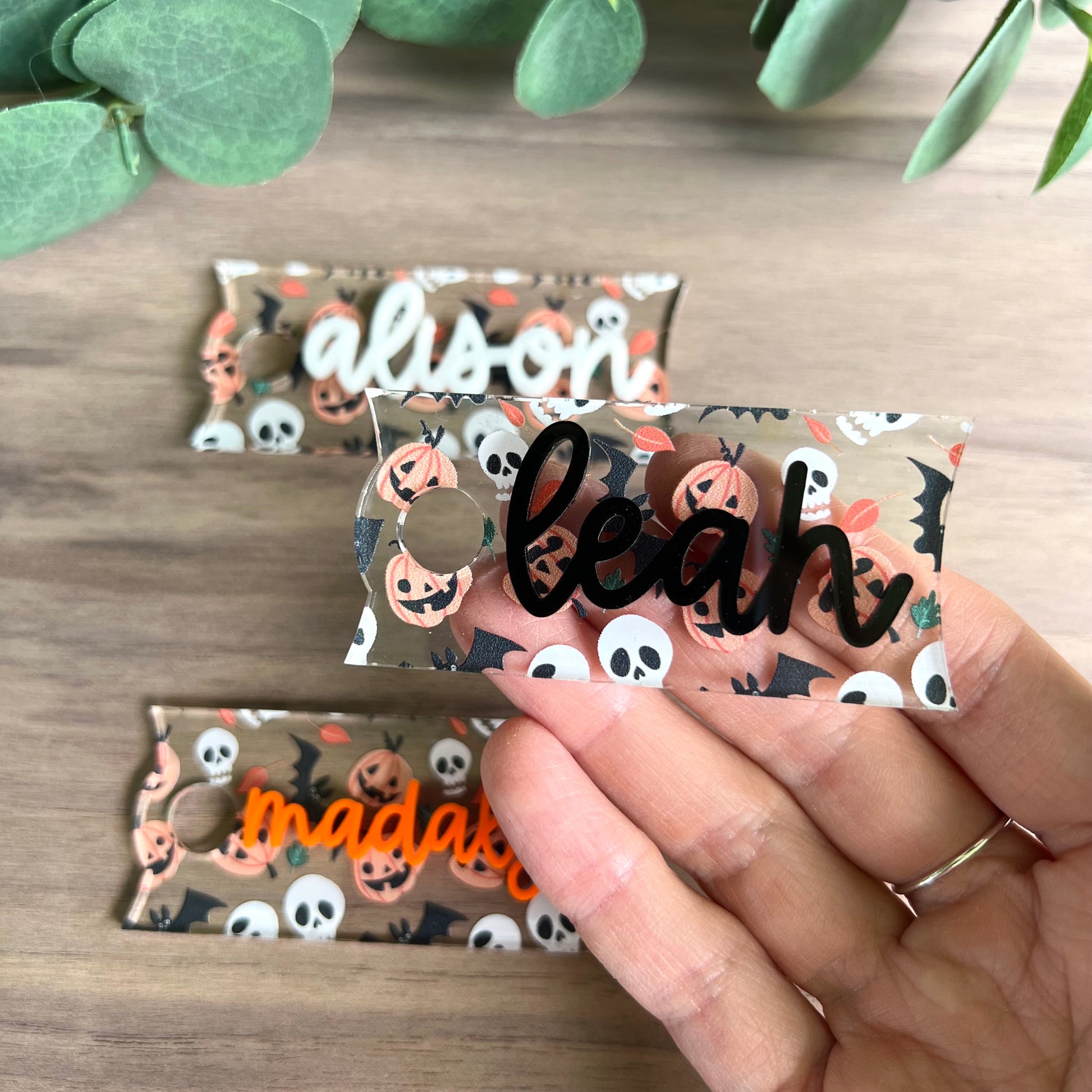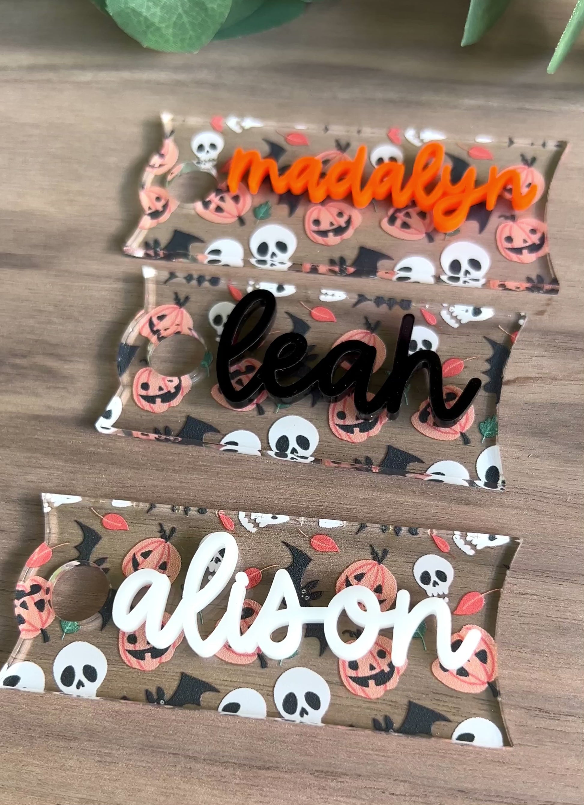 This cute tag is the perfect accessory to showcase your love for Halloween while keeping your tumbler safe from mix ups. This tumbler name plate is personalized with your name in 3D. It is clear with pumpkins, skulls and bats on it. It slides over your straw for easy installation and removal.