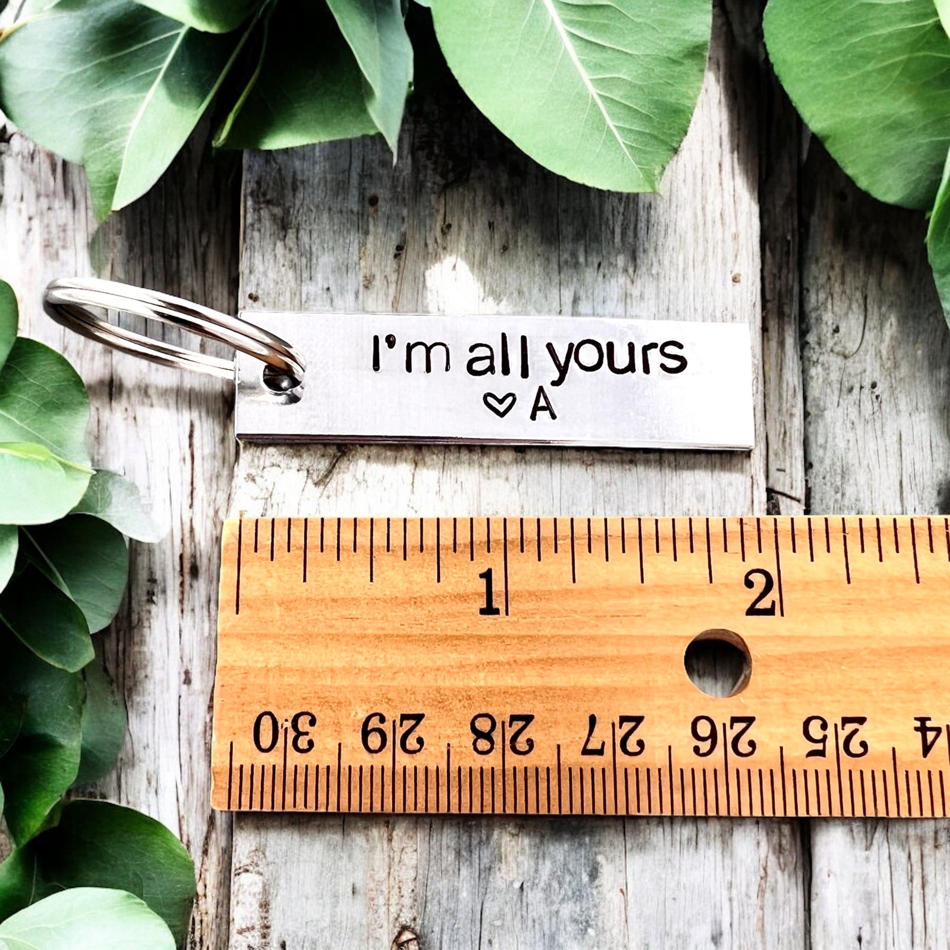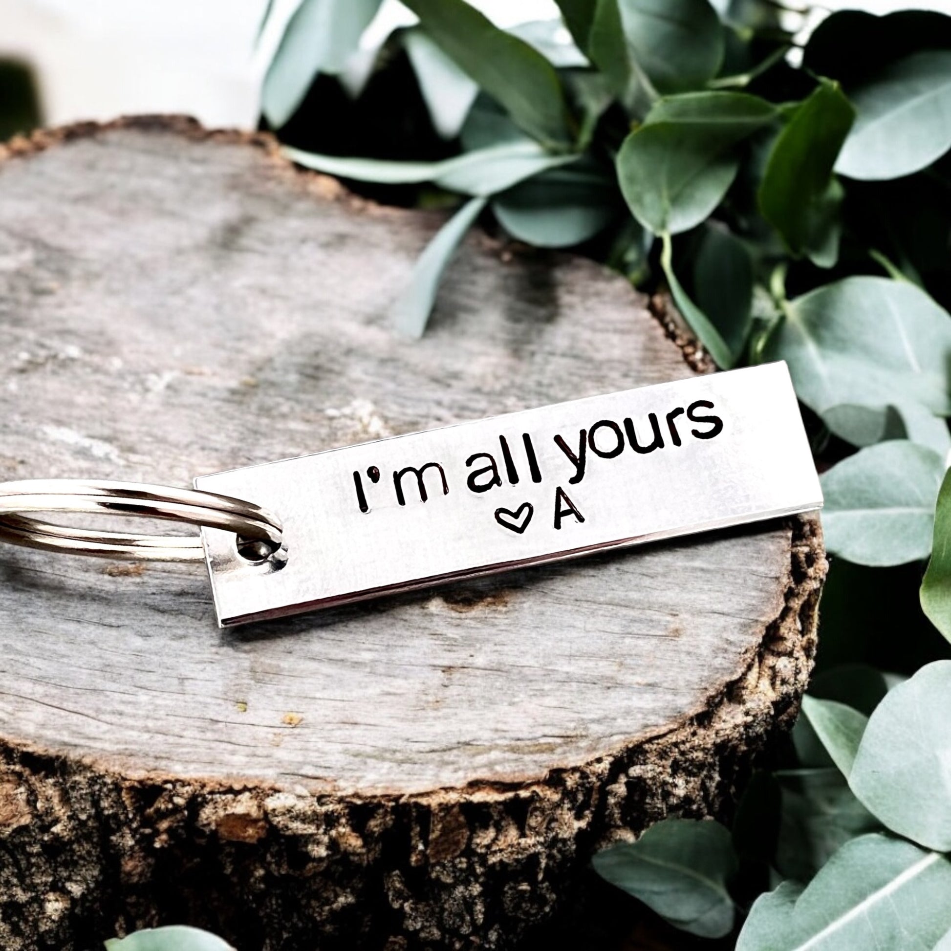 The keychain features the phrase “I’m all yours” adding a fun and playful sentiment to express commitment with a smile. Personalize it with an initial or name to create a thoughtful, customized gift for someone special.al.
