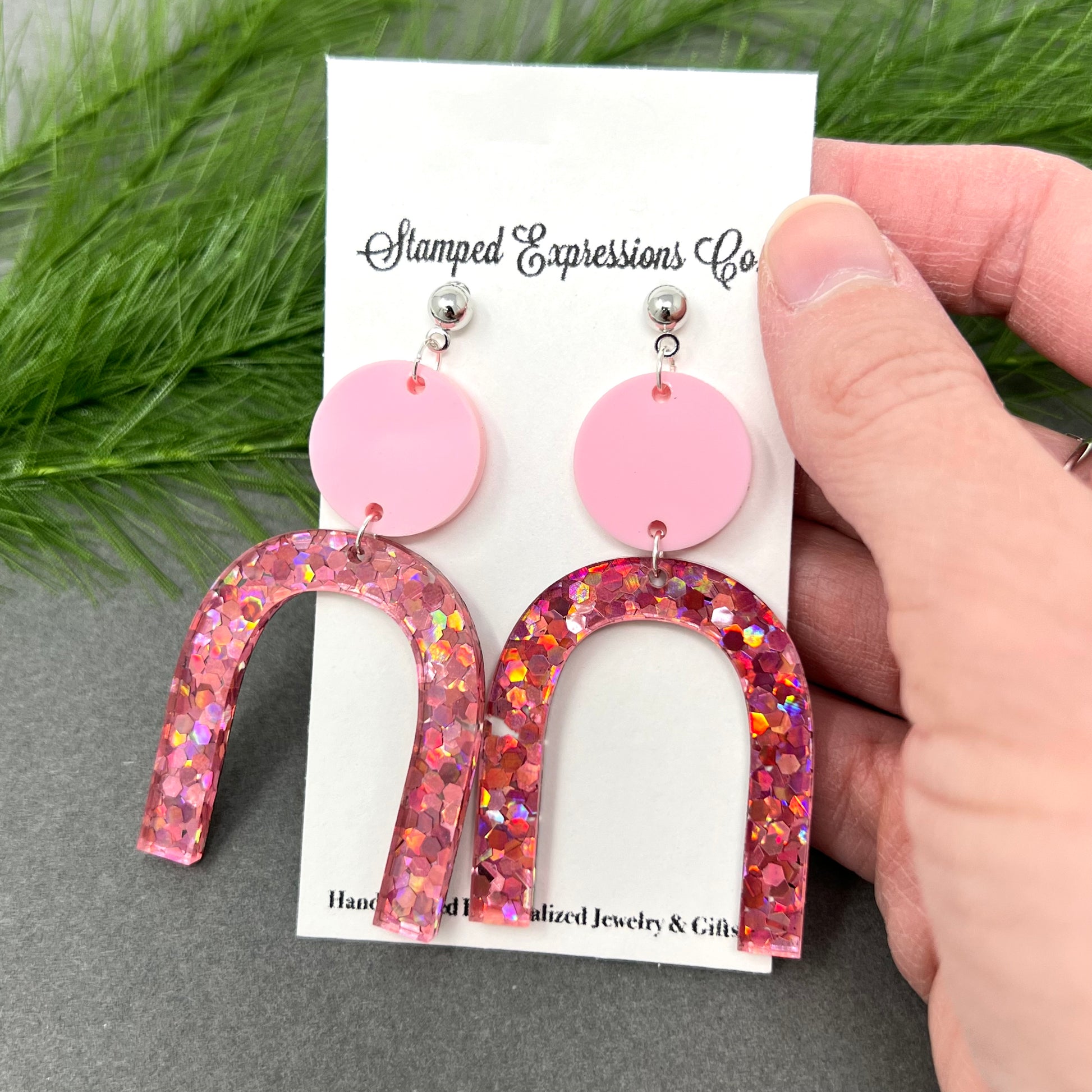 Our stunning pink arch glitter earrings are a unique addition to your jewelry collection. These cute earrings feature a delicate arch design, crafted with shimmering pink glitter acrylic that catches the light beautifully. The arch is attached to a pastel pink circle and silver ball studs, providing a secure and comfortable fit. Perfect for adding a touch of fun to your everyday look.